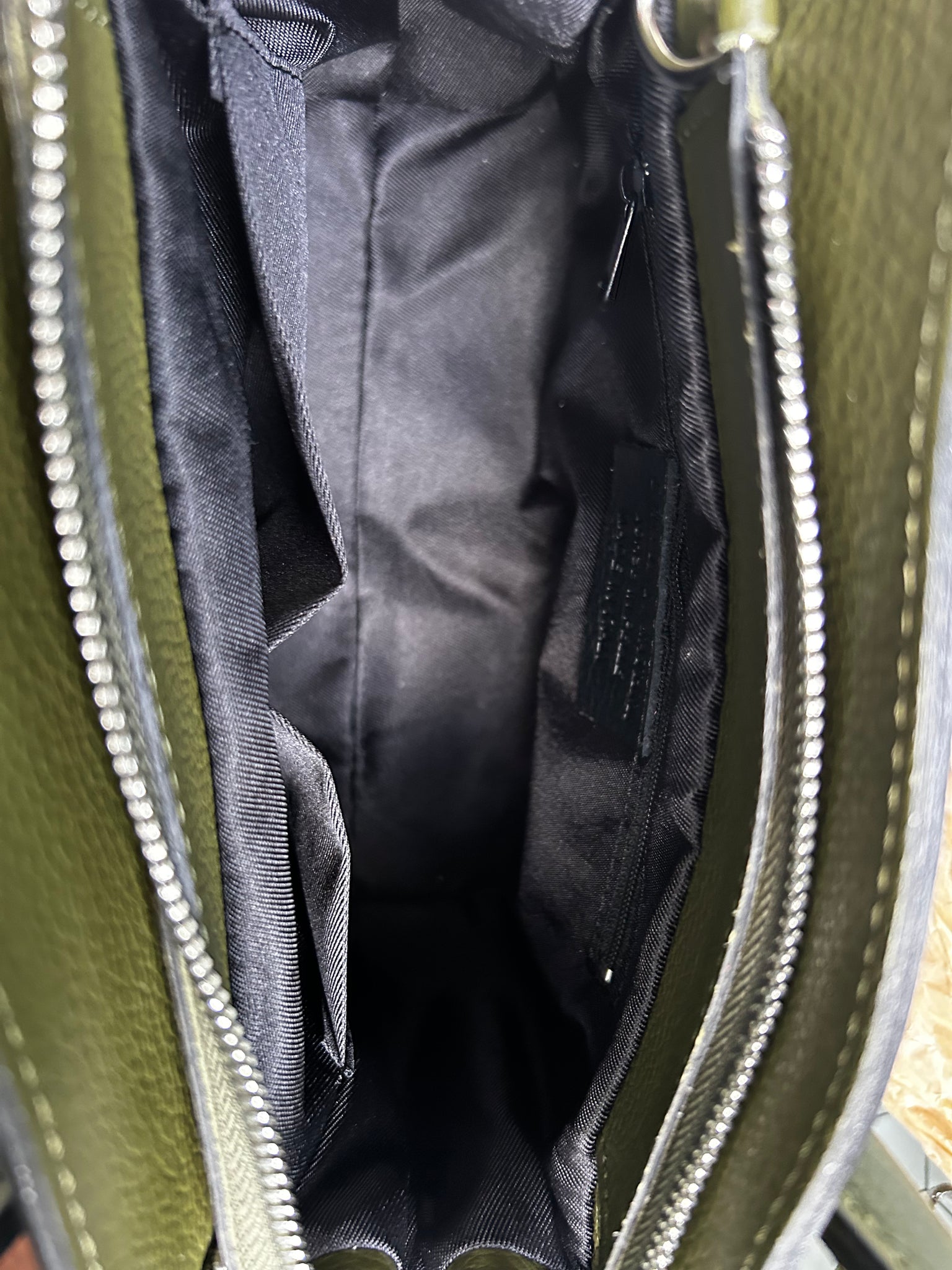 Color: Olive Green, shoulder strap, zipper pocket inside, double pocket, dark liner inside