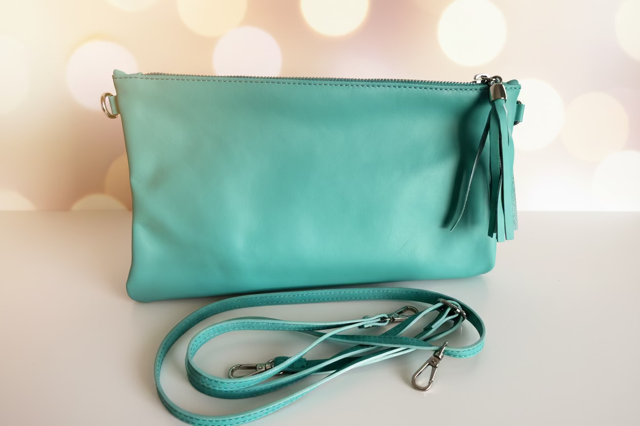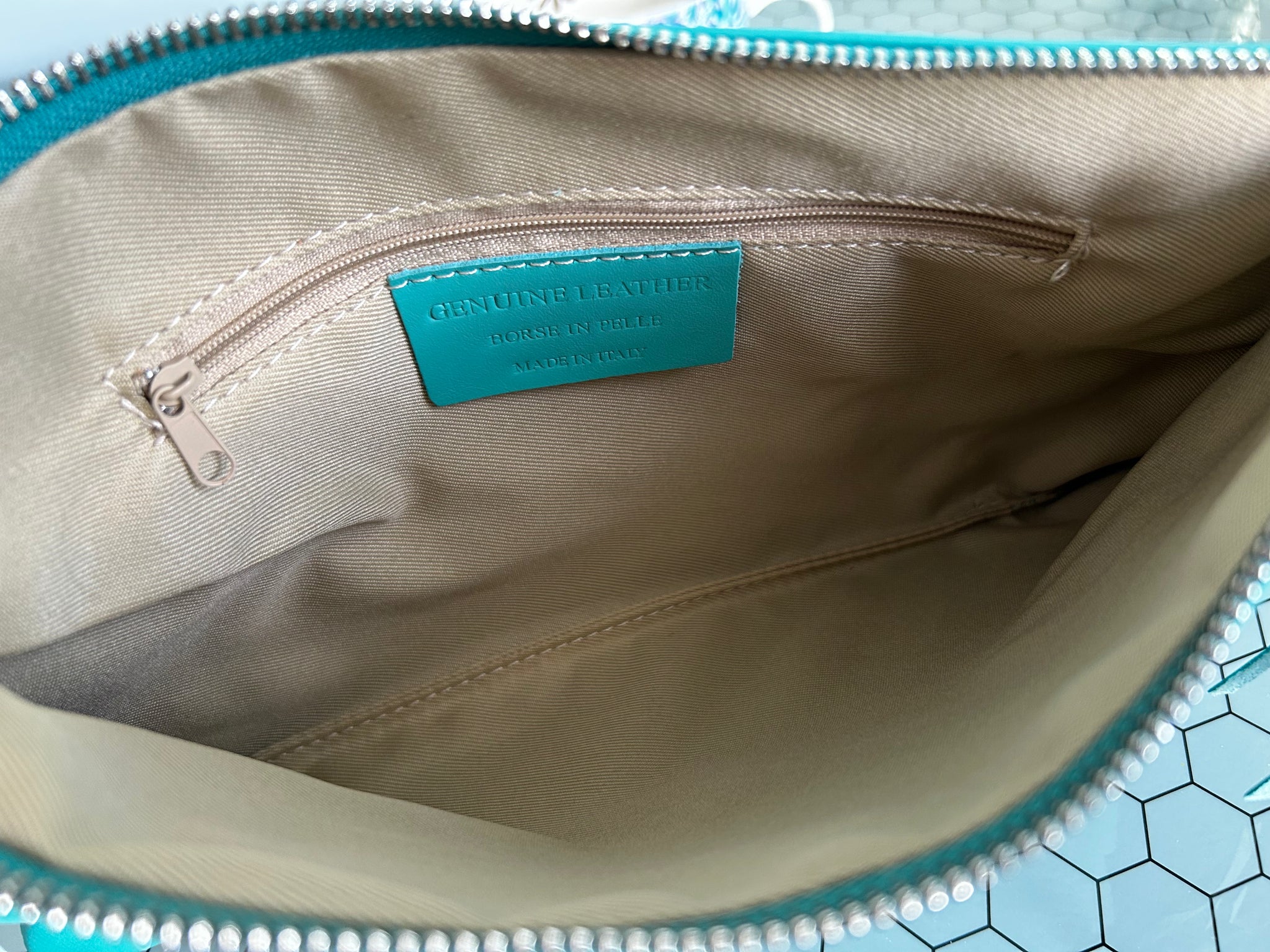 Color: Aqua, zipper pocket inside, light liner inside
